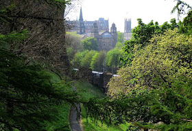 Still in West Princes Street Gardens here and after a short climb we are now on the flat balcony trail under the castle. Apart from a few spires sticking up in the distance you would never know you were still in the middle of a densely crowded city. Edinburgh can seem slightly claustrophobic at times if its very busy- with high orate buildings, packed narrow streets full of tourists, and closed in views. Some of the world's first skyscrapers started here before America got going and took the crown for building high so this green oasis is a real gem for finding a quiet spot away from the nearby hectic streets,- beggars, buskers, and bankers.